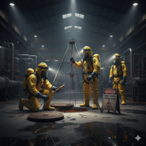 ภาพประกอบที่ 3: ทีมกู้ภัยในที่อับอากาศพร้อมอุปกรณ์ครบครัน แสดงภาพทีมกู้ภัย 2-3 คน สวมชุดป้องกันและอุปกรณ์ SCBA กำลังเตรียมพร้อมหรือกำลังดำเนินการช่วยเหลือในพื้นที่อับอากาศ โดยมีอุปกรณ์กู้ภัย เช่น ขาตั้งสามขา (Tripod) และรอก วางอยู่ใกล้ทางเข้า